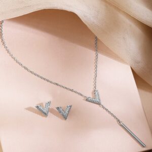 Rhodium-Plated Cubic Zirconia Studded V-Shaped Pendant Necklace Set – Silver