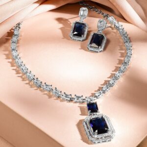Rhodium-Plated Dark Blue Sapphire & White Cubic Zirconia Premium Jewellery Set – Blue