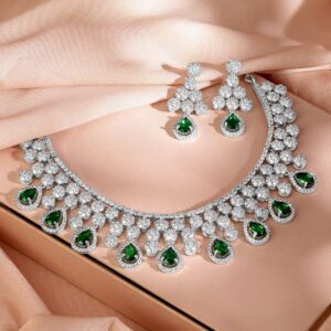 Rhodium Plated Emerald Green and White Cubic Zirconia Studded Statement Necklace Set – Green