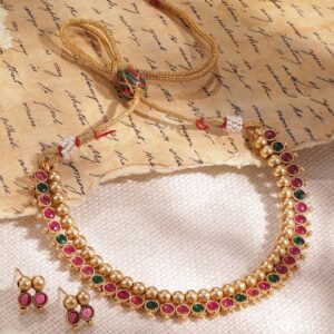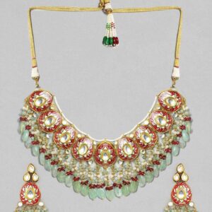 22K Gold plated Enamel And Kundan crystal with pearl beaded choker Necklace Set – Gold