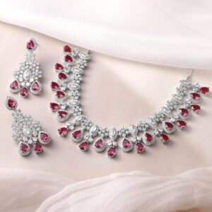 Rhodium-Plated Ruby Red & White Cubic Zirconia Studded Layered Choker Jewellery Set – Red