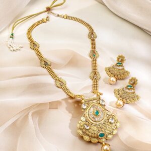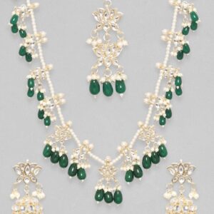 22K Gold-Plated Emerald Green & Cubic Zirconia Studded Long Necklace Set with Emerald Green & White Pearls Beaded Accents