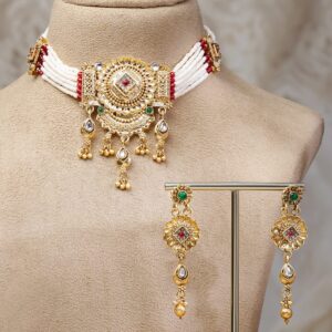 22KT Gold Plated Stylish Pearl Studded Oval Link Design Choker Necklace Set – Ruby Pink