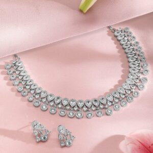 Rhodium Plated AD & Cubic Zirconia Studded Luxurious Leaf Motif Necklace Set – Silver