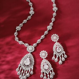 Rhodium-Plated White Cubic Zirconia Studded Floral Premium Jewellery Set