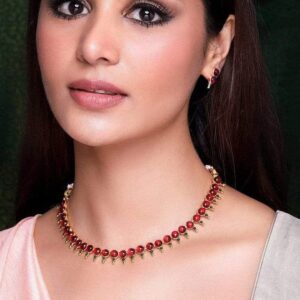 22KT Gold Plated Brass Red Stone Studded Necklace Set – Pink