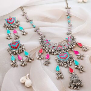 Oxidized Silver-Plated Pink & Turquoise Blue Stone Floral Jewellery Set – Silver