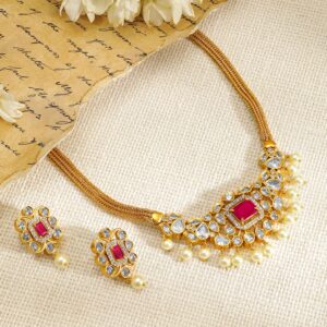 18K Gold-Plated White Kundan Choker Necklace Set With White Beads And Pearls – Gold