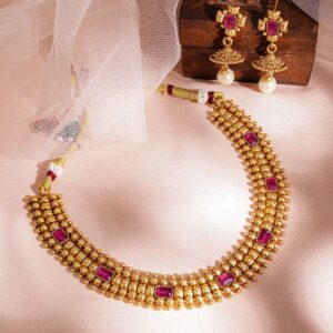 18K Gold-Plated Ruby Pink & Emerald Green Studded Temple Design Necklace Set with Golden Bead Accents for Women