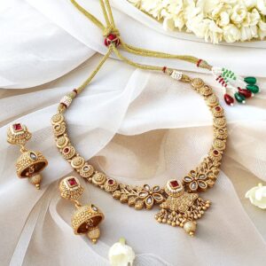 24K Gold-Plated Ruby & Kundan Studded Floral Design Necklace Set with Jhumkas – Gold