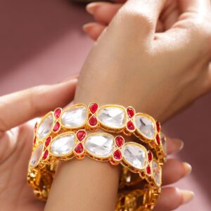 Set of 4, 18K Gold-Plated Ruby Pink & Emerald Green Stone Studed Traditional Bangle – 2.6