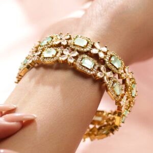 Set of 2 18K Gold-Plated Mint Green & White Cubic Zirconia Studded Floral Bangles – 2.8