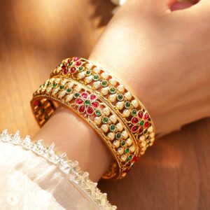 Set of 2, 22K Gold-Plated Ruby Pink & Emerald Green Stone Studded Handcrafted Bangles – 02-Apr
