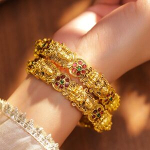 Set of 2 24K Gold-Plated Ruby Red & Green Stone Studded Temple Bangles with Lakshmi Motif – 2.4