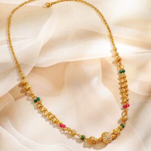 It’s a necklace for the queens! Exude the royal vibe with this AD studded necklace this necklace is crafted from gold plated brass, stones Occasion : Bring your style to a whole new level with this handcrafted piece of jewellery. When you’re celebrating a special Occasion : – a birthday, wedding, or personal milestone – this piece adds that extra something that makes us feel special and looking our best. Material & Care Dimension : Length 42.2 cm; Width 1.2 cm: Collection : Gold Tone Material: Brass Net Weight: 35 Gram Net Quantity: 1 Necklace Care Label: It is advisable to avoid contact with water and organic chemicals i.e. perfume sprays. Store jewellery in airtight box. After use, wipe the jewellery with soft cotton cloth.