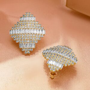 Earrings : These 18K gold-plated statement stud earrings are adorned with dazzling cubic zirconia stones, perfect for a bold and glamorous look. Occasion : Bring your style to a whole new level with this handcrafted piece of jewellery. When you’re celebrating a special Occasion : – a birthday, wedding, or personal milestone – this piece adds that extra something that makes us feel special and looking our best. Material : & Care Dimension : Length : 3.4 cm, Width: 2.7 cm Net Weight: 10.24 g Net Quantity : 1 Pair Of Earrings Material : Brass Care Label : It is advisable to avoid contact with water and organic chemicals i.e. perfume sprays. Store jewellery in airtight box. After use, wipe the jewellery with soft cotton cloth.
