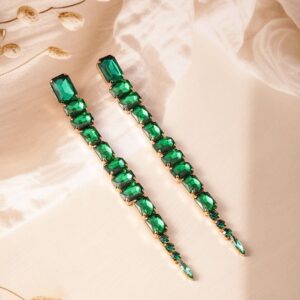 Elevate your style with these luxurious 18K Gold Plated Shoulder Duster Drop Earrings, intricately studded with vibrant Emerald Green stones. The elongated design adds a dramatic flair, making these earrings the perfect statement piece for a glamorous look. Crafted with attention to detail, these earrings are ideal for adding a touch of elegance to any outfit. The secure setting ensures durability, while the dazzling emerald green stones capture the light beautifully, enhancing your overall ensemble. Perfect for those who appreciate bold and sophisticated jewelry. Material: Wipe with a clean, dry cloth to remove dust Size : Length : 14 cm, Width : 2 cm