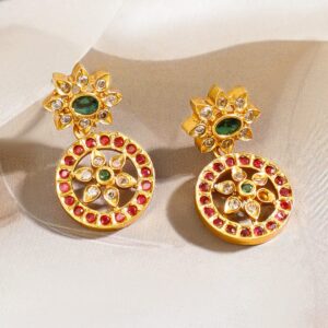 This 18K gold-plated floral necklace set features ruby pink and emerald green stones with detailed handcrafted patterns, perfect for bridal, festive, and ethnic traditional wear. Styling Versatility: Ideal for sarees, lehengas, and traditional outfits, this floral design set suits brides, bridesmaids, and festive gatherings with effortless ethnic elegance. Material & Care Dimension : Length : Necklace : 15 cm Earrings : 4 cm Width : Necklace : 2.5 cm Earrings : 1.5 cm Material: Brass Net Weight: 18.07 Gram Net Quantity: 1 Necklace & 1 Pair of Earrings Care Label: It is advisable to avoid contact with water and organic chemicals i.e. perfume sprays. Store jewellery in airtight box. After use, wipe the jewellery with soft cotton cloth.