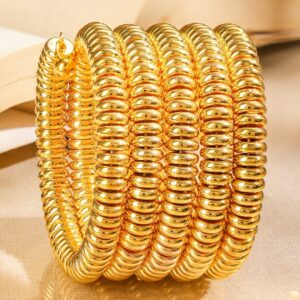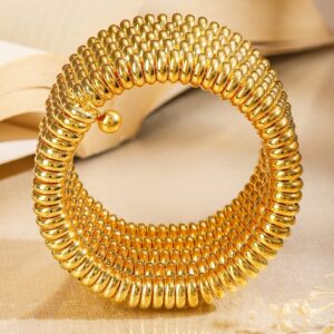 Bracelet : This 18K gold-plated coiled bracelet from features high-shine golden beads in a stacked spiral design. Its flexible structure ensures a comfortable fit, ideal for festive wear and party looks. Occasion : Bring your style to a whole new level with this handcrafted piece of jewellery. When you’re celebrating a special Occasion : – a birthday, daily minimal, parties or personal milestone – this piece adds that extra something that makes us feel special and looking our best. Material & Care Circumference : 18.8 cm Type : Wraparound Net Quantity : 1 Bracelet Material : Brass Care Label : It is advisable to avoid contact with water and organic chemicals i.e. perfume sprays. Store jewellery in airtight box. After use, wipe the jewellery with soft cotton cloth.