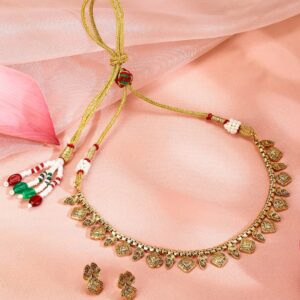 Jewellery Set : This 18k gold-plated handcrafted jewellery set features intricate square and paisley motifs, showcasing a traditional design. Perfect for pairing with ethnic ensembles for a refined look. Occasion : Bring your style to a whole new level with this handcrafted piece of jewellery. When you’re celebrating a special Occasion : – a birthday, wedding, festive or personal milestone – this piece adds that extra something that makes us feel special and looking our best. Material : & Care Dimension : Length : 18 cm / cm Width : 16 cm / 1 cm Material : Brass Care Label : It is advisable to avoid contact with water and organic chemicals i.e. perfume sprays. Store jewellery in airtight box. After use, wipe the jewellery with soft cotton cloth.