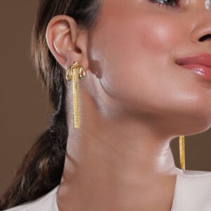 Earrings : These drop earrings feature an elegant knot design with long, flowing tassels, all in a luxurious 18K gold plating. The intricate detailing of the knots combined with the sleek tassels creates a statement look, perfect for enhancing any outfit with a touch of refined style. Occasion : Bring your style to a whole new level with this handcrafted piece of jewellery. When you’re celebrating a special Occasion : – a birthday, wedding, or personal milestone – this piece adds that extra something that makes us feel special and looking our best. Material : & Care Dimension : Earrings Size : 5 cm Material :Brass Care Label : It is advisable to avoid contact with water and organic chemicals i.e. perfume sprays. Store jewellery in airtight box. After use, wipe the jewellery with soft cotton cloth.