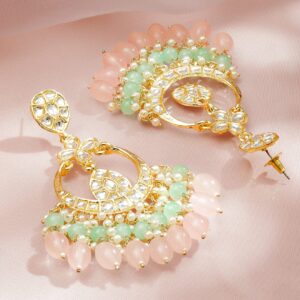 Earrings : 18K Gold-Plated handcrafted big size Chandbali Earrings with Kundan detailing & pastel pink-green beads. Perfect for weddings, parties & festive occasions. Occasion Ready: Ideal for weddings, festive celebrations, and party wear, offering bold ethnic elegance. Material : & Care Dimension : Length : 7 ; Width : 4 cm Net Weight : 39 Gram Material : Brass Net Quantity : 1 pair Earrings Care Label :   It is advisable to avoid contact with water and organic chemicals i.e. perfume sprays. Store jewellery in airtight box. After use, wipe the jewellery with soft cotton cloth.