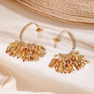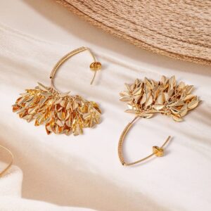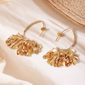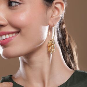 Earrings : These 18K gold plated earrings feature an exquisite leaf cluster design, with intricate layers of polished leaves cascading elegantly. The unique and nature-inspired pattern creates a dynamic look, making these earrings a stunning addition to any jewelry collection. Perfect for adding a touch of luxury and sophistication to your ensemble. Occasion : Bring your style to a whole new level with this handcrafted piece of jewellery. When you’re celebrating a special Occasion : – a birthday, wedding, or personal milestone – this piece adds that extra something that makes us feel special and looking our best. Material : & Care Dimension : Size : Length : 7 cm, Width : 1.7 cm Material :Brass Care Label : It is advisable to avoid contact with water and organic chemicals i.e. perfume sprays. Store jewellery in airtight box. After use, wipe the jewellery with soft cotton cloth.