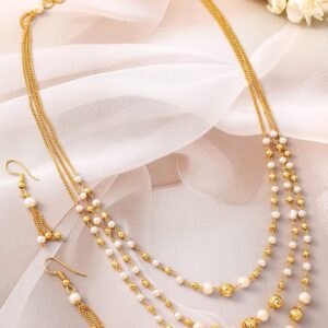 This 18K gold-plated multilayer necklace set features delicate pearl beads combined with golden accents, creating a sophisticated design. Paired with matching earrings, it€™s perfect for adding elegance to any outfit. Occasion : Bring your style to a whole new level with this handcrafted piece of jewellery. When you’re celebrating a special Occasion : – a birthday, wedding, festive or personal milestone – this piece adds that extra something that makes us feel special and looking our best. Material & Care Dimension : Length : Necklace – 35 cm ; Earrings – 1.5 cm Width : 1 cm Material: Brass Net Weight: 20 Gram Net Quantity: 1 Necklace & 1 Pair of Earrings Care Label: It is advisable to avoid contact with water and organic chemicals i.e. perfume sprays. Store jewellery in airtight box. After use, wipe the jewellery with soft cotton cloth.
