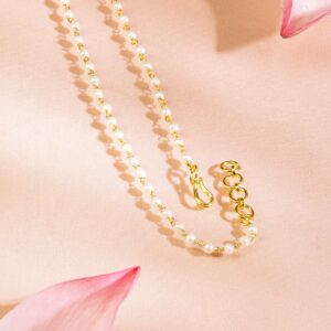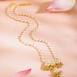 Necklace : This 18K gold-plated brass necklace features a handcrafted white pearl beaded chain, kundan-studded pendant, and golden bead drops—perfect for ethnic celebrations, sangeet functions, or festive looks. Perfect for Traditional Styling: Ideal for sangeet, mehendi, festive gatherings or pairing with sarees and traditional suits, this necklace balances subtlety with heritage-inspired detailing. Material & Care Dimension : Length : 27 cm ; Width : 3 cm Material: Brass Net Weight: 9.68 Gram Net Quantity: 1 Necklace Care Label: It is advisable to avoid contact with water and organic chemicals i.e. perfume sprays. Store jewellery in airtight box. After use, wipe the jewellery with soft cotton cloth.