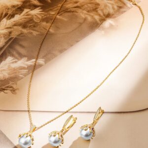Jewellery Set : This elegant 18K gold-plated jewelry set features a delicate chain necklace and matching earrings adorned with luminous pearls and sparkling cubic zirconia. The intricate design adds a touch of sophistication, making it perfect for any occasion. Occasion : Bring your style to a whole new level with this handcrafted piece of jewellery. When you’re celebrating a special Occasion : – a birthday, wedding, or personal milestone – this piece adds that extra something that makes us feel special and looking our best. Material : & Care Dimension : Length : 22 cm / 1.5 cm, Width: 3 cm / 1.5 cm Net Weight: 16.25 g Net Quantity : 1 Necklace & 2 Earrings Material :Brass Care Label : It is advisable to avoid contact with water and organic chemicals i.e. perfume sprays. Store jewellery in airtight box. After use, wipe the jewellery with soft cotton cloth.