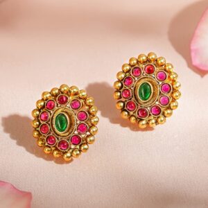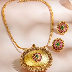 Jewellery Set: This 18K gold-plated brass pendant set features a bold circular design with floral carving and ruby red stones, ideal for festive and wedding wear. Ideal for Weddings & Festive Occasions: This bold pendant set makes a stunning choice for wedding ceremonies, traditional events, and festive celebrations. Material : & Care Dimension : Necklace : Length : 30 cm ; Earrings : 5.5 cm Necklace : Width : 2.5 cm ; Earrings : 3.5 cm Material: Brass Net Weight: 47.82 Gram Net Quantity: 1 Necklace & 1 Pair of Earrings Care Label: It is advisable to avoid contact with water and organic chemicals i.e. perfume sprays. Store jewellery in airtight box. After use, wipe the jewellery with soft cotton cloth.
