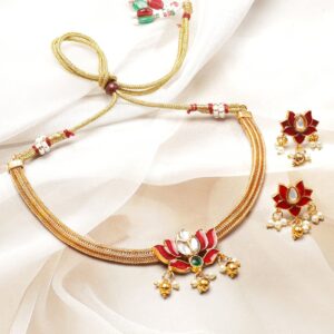 Jewellery Set : This 18K gold-plated choker necklace set features a red enamel lotus motif with kundan detailing and pearl bead hangings, perfect for festive and ethnic styles. Festive & Cultural Appeal: Whether worn for poojas, festive gatherings, or traditional occasions, this choker set adds refined beauty to sarees, lehengas, and ethnic suits effortlessly. Material : & Care Dimension : Size : Length : Necklace : 12 cm, Earrings : 3 cm Width : Necklace : 2.5 cm, Earrings : 1.5 cm Net Quantity : 1 Necklace & 2 Earrings Net Weight: 20.97 g Material : Brass Care Label : It is advisable to avoid contact with water and organic chemicals i.e. perfume sprays. Store jewellery in airtight box. After use, wipe the jewellery with soft cotton cloth.