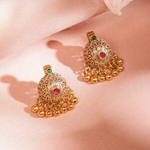 Be the first to review “18K Gold-Plated Ruby & Emerald Studded Temple Motif Gold Beaded Necklace Set for Women”