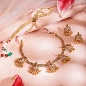 Jewellery Set : This 18K gold-plated necklace set features ruby and emerald studded temple motifs with gold beaded detailing and matching earrings—perfect for women & girls for festive and wedding looks. Occasion : Bring your style to a whole new level with this handcrafted piece of jewelry. When you’re celebrating a weddings, festive occasions & traditional ceremonies, this piece adds that extra something that makes us feel special and looking our best. Material & Care Dimension : Length Size : Necklace : 20.5 cm, Earrings : 2.8 cm Dimension : Width : Necklace : 1.5 cm, Earrings : 1.5 cm Net Quantity : 1 Necklace & 1 Pair of Earrings Net Weight: 39.70 Gram Material : Brass Care Label : It is advisable to avoid contact with water and organic chemicals i.e. perfume sprays. Store jewellery in airtight box. After use, wipe the jewellery with soft cotton cloth.