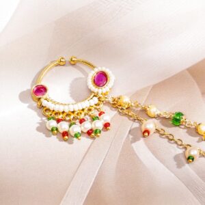 Be the first to review “18K Gold-Plated Ruby Kundan Studded Multi-Colour Pearl Bead Triple-Layer Chain Nath Nosepin”