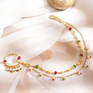 This 18K gold-plated nath features ruby pink kundan studded detailing with triple-layer gold chains adorned in multi-colored pearl beads. Designed for bridal styling, it adds a rich, ethnic charm with vibrant colors and traditional motifs. Cultural Grace & Gifting: A symbolic and stylish gift for brides or festive celebrations. This floral Nath brings timeless cultural grace to every traditional jewellery collection. Material & Care Dimension: Length: 22 cm ; Width: 2.5 cm Material: Brass Net Weight: 8.22 Gram Net Quantity: 1 Chain Nath Nosepin Care Label: It is advisable to avoid contact with water and organic chemicals i.e. perfume sprays. Store jewellery in airtight box. After use, wipe the jewellery with soft cotton cloth.
