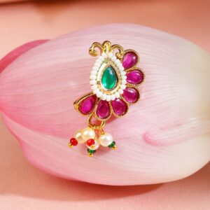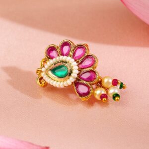 This 22K gold-plated floral nath features a teardrop emerald green center, surrounded by ruby pink petal motifs and pearl accents—crafted in a non-pierced clip-on style for graceful bridal elegance. Cultural Grace & Gifting: A symbolic and stylish gift for brides or festive celebrations. This floral Nath brings timeless cultural grace to every traditional jewellery collection. Material & Care Dimension: Length: 2.5 cm ; Width: 1.5 cm Material: Brass Net Weight: 3.69 Gram Net Quantity: 1 Nath Nosepin Care Label: It is advisable to avoid contact with water and organic chemicals i.e. perfume sprays. Store jewellery in airtight box. After use, wipe the jewellery with soft cotton cloth.