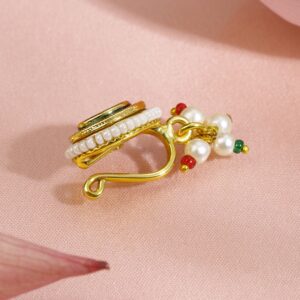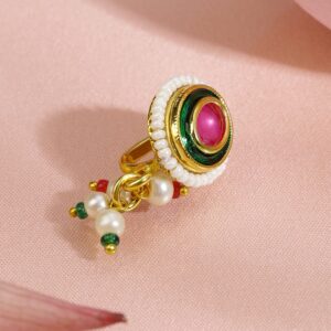 This 18K gold-plated non-pierced clip-on nath features a ruby pink stone, green enamel detailing, pearl border, and multicolor bead drops—crafted for timeless bridal elegance. Cultural Grace & Gifting: A symbolic and stylish gift for brides or festive celebrations. This floral Nath brings timeless cultural grace to every traditional jewellery collection. Material & Care Dimension: Length: 2..5 cm ; Width: 1 cm Material: Brass Net Weight: 2.54 Gram Net Quantity: 1 Nath Nosepin Care Label: It is advisable to avoid contact with water and organic chemicals i.e. perfume sprays. Store jewellery in airtight box. After use, wipe the jewellery with soft cotton cloth.