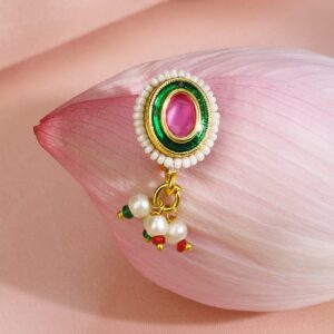 Be the first to review “18K Gold-Plated Ruby Pink Stone Oval Non-Pierced Clip-On Nath with Green Enamel & Pearl Drops”
