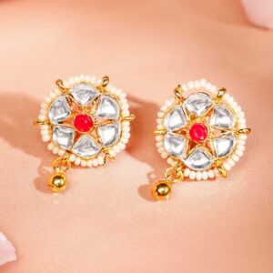 Jewellery Set : This 18K gold-plated choker necklace set is adorned with ruby pink and white Kundan stones, elegantly enhanced with gold bead drops. The intricate detailing and regal craftsmanship make this set a perfect choice for weddings, festive occasions, and cultural celebrations. Occasion : Bring your style to a whole new level with this handcrafted piece of jewellery. When you’re celebrating a special Occasion : – a birthday, wedding, or personal milestone – this piece adds that extra something that makes us feel special and looking our best. Material : & Care Dimension : Size : Necklace : 20 cm, Earrings : 2.3 cm Net Quantity : 1 Necklace & 2 Earrings Net Weight: 31.80 g Material :Brass Care Label : It is advisable to avoid contact with water and organic chemicals i.e. perfume sprays. Store jewellery in airtight box. After use, wipe the jewellery with soft cotton cloth.