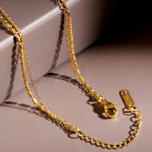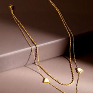 Chain & Necklace : This 18K gold-plated stainless steel layered necklace features elegant white enamel heart charms, adding a romantic and sophisticated touch. Tarnish-free & waterproof, perfect for daily wear & styling. Occasion : Bring your style to a whole new level with this handcrafted piece of jewellery. When you’re celebrating a special Occasion : – a birthday, wedding, or personal milestone – this piece adds that extra something that makes us feel special and looking our best. Material : & Care Dimension : Size : Length : 21 cm, Width : 1 cm Net Weight: 5.26 g Net Quantity : 1 Chain & Necklace Material :Stainless Steel Care Label : It is advisable to avoid contact with water and organic chemicals i.e. perfume sprays. Store jewellery in airtight box. After use, wipe the jewellery with soft cotton cloth.