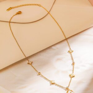 Chain & Necklace : This exquisite necklace features 18K gold plating on stainless steel, adorned with floral and diamond-shaped charms, offering a tarnish-free and waterproof finish for lasting brilliance. Occasion : Bring your style to a whole new level with this handcrafted piece of jewellery. When you’re celebrating a special Occasion : – a birthday, wedding, or personal milestone – this piece adds that extra something that makes us feel special and looking our best. Material : & Care Dimension : Size : Length : 21 cm, Width : 1.2 cm Net Weight: 4.87 g Net Quantity : 1 Chain & Necklace Material :Stainless Steel Care Label : It is advisable to avoid contact with water and organic chemicals i.e. perfume sprays. Store jewellery in airtight box. After use, wipe the jewellery with soft cotton cloth.