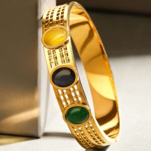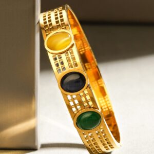 Bracelet : This bold 18K gold-plated stainless steel bangle bracelet features vibrant yellow, black, and green gemstones in a modern cutout lattice design, offering a luxurious and waterproof demi-fine finish. Occasion : Bring your style to a whole new level with this handcrafted piece of jewellery. When you’re celebrating a special Occasion : – a birthday, wedding, or personal milestone – this piece adds that extra something that makes us feel special and looking our best. Material : & Care Dimension : Length : 6 cm, Width: 1 cm Net Weight: 36.2 g Net Quantity : 1 Bracelet Material :Stainless steel Care Label : It is advisable to avoid contact with water and organic chemicals i.e. perfume sprays. Store jewellery in airtight box. After use, wipe the jewellery with soft cotton cloth.