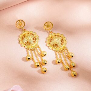 Jewellery Set : This 18K Gold-Plated traditional necklace set features a floral filigree design with cascading multilayer gold beads and matching earrings. A statement piece perfect for bridal and festive occasions. Occasion : Bring your style to a whole new level with this handcrafted piece of jewelry. When you’re celebrating a weddings, festive occasions & traditional ceremonies, this piece adds that extra something that makes us feel special and looking our best. Material & Care Dimension : Length Size : Necklace : 20 cm, Earrings : 7.5 cm Dimension : Width : Necklace : 3.5 cm, Earrings : 2.5 cm Plating : Gold Plated Net Quantity : 1 Necklace & 1 Pair of Earrings Net Weight: 42.91 Gram Material : Brass Care Label : It is advisable to avoid contact with water and organic chemicals i.e. perfume sprays. Store jewellery in airtight box. After use, wipe the jewellery with soft cotton cloth.