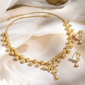 Jewellery Set : This 18K gold-plated floral necklace set features sparkling white cubic zirconia in a vine-inspired design, paired with drop earrings. A graceful and elegant look for women & girls for festive and special occasions. Occasion : Bring your style to a whole new level with this handcrafted piece of jewelry. When you’re celebrating a weddings, festive occasions & traditional ceremonies, this piece adds that extra something that makes us feel special and looking our best. Material & Care Dimension : Length Size : Necklace : 13 cm, Earrings : 2.5 cm Dimension : Width : Necklace : 1.5 cm, Earrings : 1 cm Plating : Gold Plated Net Quantity : 1 Necklace & 1 Pair of Earrings Net Weight: 24.27 Gram Material : Brass Care Label : It is advisable to avoid contact with water and organic chemicals i.e. perfume sprays. Store jewellery in airtight box. After use, wipe the jewellery with soft cotton cloth.