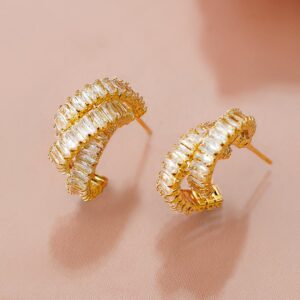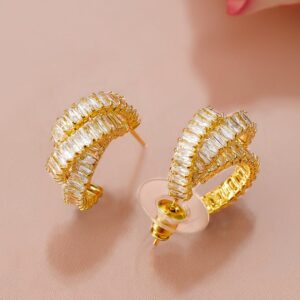 Earrings : These 18K gold-plated earrings feature an oversized half-hoop silhouette encrusted with multiple baguette-cut and round cubic zirconia studs, offering a statement look perfect for festive and party wear. Festive & Party Perfect: These statement earrings are perfect for festive celebrations, receptions, or any high-glam event. Their bold design and full ear coverage make them an elegant choice for upscale occasions. Material : & Care Dimension : Length : 2.5 cm ; Width : 2.5 cm Net Weight : 25 Gram Material : Brass Net Quantity : 1 Pair of Earrings Care Label : It is advisable to avoid contact with water and organic chemicals i.e. perfume sprays. Store jewellery in airtight box. After use, wipe the jewellery with soft cotton cloth.