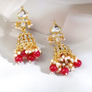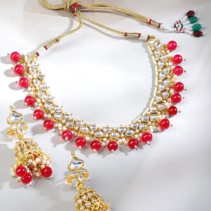 Necklace Set : This 18K gold-plated choker set in rich gold tone features kundan stones, ruby red beads, and pearls, with matching jhumkas—perfect for bridal looks and traditional festive wear. Bridal & Festive Ready: Ideal for weddings, sangeet functions, and bridal styling, this choker set pairs beautifully with lehengas, sarees, and ornate bridal wear. Material : & Care Dimension : Length: Necklace : 17 cm ; Earrings: 2.5 cm Width : Necklace : 6 cm ; Earrings: 2 cm Net Weight : 67.97 Gram Material : Brass Collection : Kundan(Gold) Net Qnty : 1 Necklace, 1 Pair of Earrings Care Label : It is advisable to avoid contact with water and organic chemicals i.e. perfume sprays. Store jewellery in airtight box. After use, wipe the jewellery with soft cotton cloth.