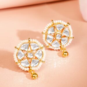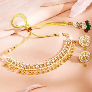Jewellery Set : This 18K gold-plated choker set is adorned with white Kundan stones and gold bead detailing, offering a royal and sophisticated look. The matching earrings and intricate craftsmanship make this set perfect for weddings, festive occasions, and cultural celebrations Occasion : Bring your style to a whole new level with this handcrafted piece of jewellery. When you’re celebrating a special Occasion : – a birthday, wedding, or personal milestone – this piece adds that extra something that makes us feel special and looking our best. Material : & Care Dimension : Size : Necklace : 19 cm, Earrings : 2.2 cm Net Quantity : 1 Necklace & 2 Earrings Net Weight: 33.16 g Material :Brass Care Label : It is advisable to avoid contact with water and organic chemicals i.e. perfume sprays. Store jewellery in airtight box. After use, wipe the jewellery with soft cotton cloth.
