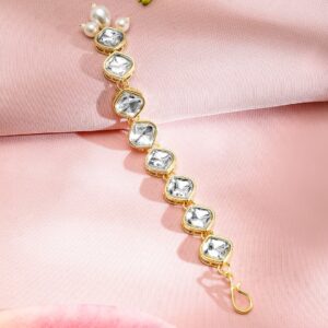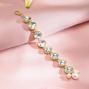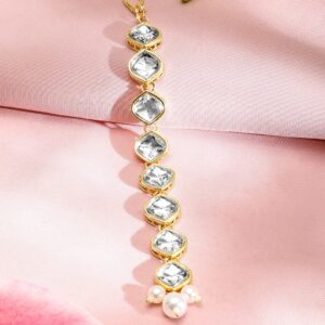 Head Jewellery : This 18K gold-plated maangtika features elegant white kundan stones set in a delicate pattern, finished with dainty white pearls. Perfect for adding a touch of traditional charm to any ethnic look Occasion : Bring your style to a whole new level with this handcrafted piece of jewellery. When you’re celebrating a special Occasion : – a birthday, wedding, or personal milestone – this piece adds that extra something that makes us feel special and looking our best. Material : & Care Dimension : Length : 7 cm, Width: 2 w Net Weight: 8 g Net Quantity : 1 Maang Tikka Material :Brass Care Label : It is advisable to avoid contact with water and organic chemicals i.e. perfume sprays. Store jewellery in airtight box. After use, wipe the jewellery with soft cotton cloth.