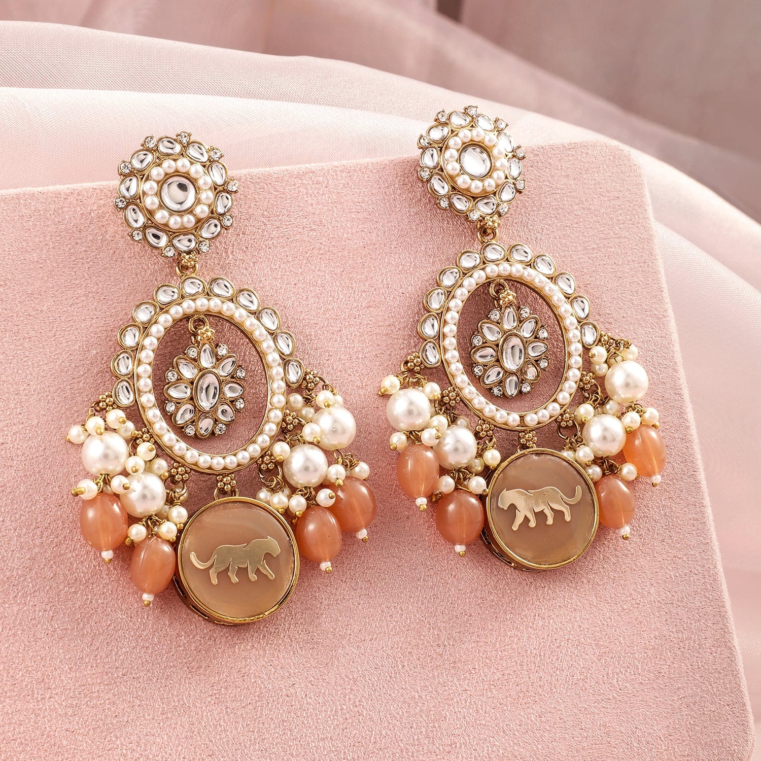 These 18K mehndi gold-plated chandelier earrings feature intricate Kundan work, white pearl-like beads, peach-colored beads, and a bold lion motif, making them perfect for festive and wedding looks. Material & Care Length : 8 cm ; Width: 5 cm Material : Brass Care Label : It is advisable to avoid contact with water and organic chemicals i.e. perfume sprays. Store jewellery in airtight box. After use, wipe the jewellery with soft cotton cloth.